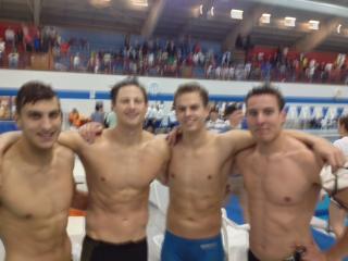 The girls swam a solid relay Ashlyn 53.8, Cassandra 55.2, Jaime 54.7 and Rebekah was 56+ on the end for a 3:41. The Men raced a great relay setting a new Meet, Team and State record at 2:58.28. Nick 45.7, Adam 42.9, Steve 43.6 and Kevin finsihed with a 45.8.