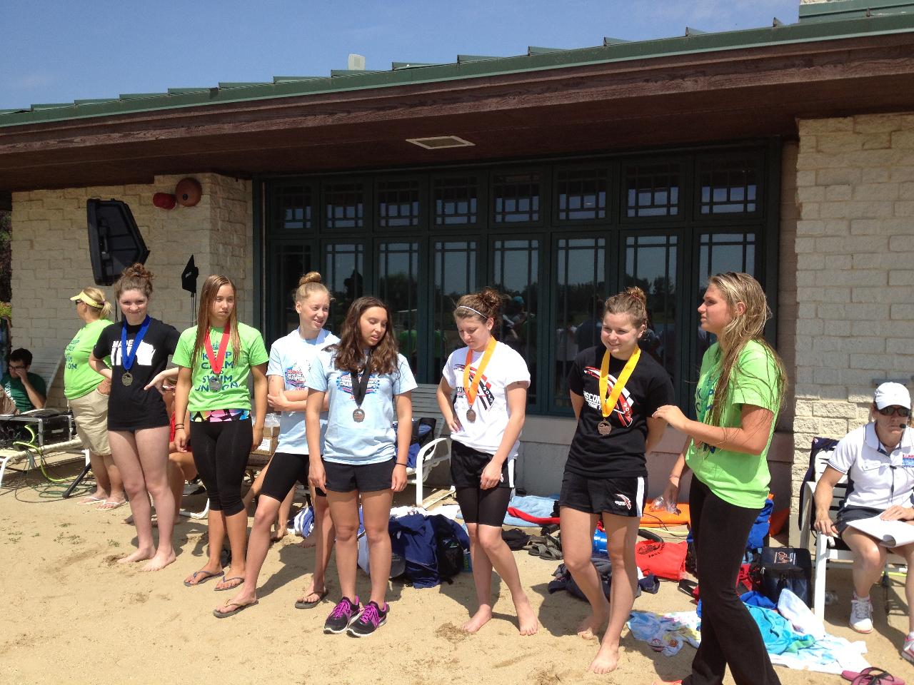 On a near perfect day of sun and light breeze, over 300 athletes from different age groups representing their LSCs met in Pleasant Prairie to race in the inaugural Central Zone Open Water Championships. The 15 & Overs raced a 3 lap 5 KM course. Five SSTY swimmers were on Team Wisconsin and had a good race for about 1 hour.