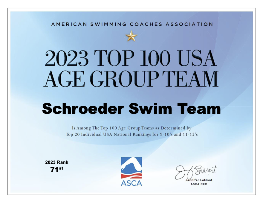 Schroeder has been recognized by the America Swimming Coaches Assn as one of the USA's Top Age Group programs. based on Top 20 Individual USA National Rankings for 9/10 and 11/12 year old athletes.