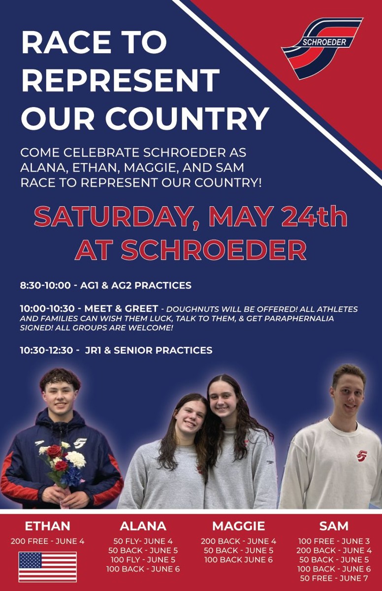 Schroeder has four athletes (Ethan Schutten, Maggie Dickinson, Alana Berlin, and Sam Lorenz) racing at the World Champ trials in the first week of June! To celebrate Schroeder and these athletes as well as to continue to build the future for our upcoming athletes we invite everyone to a special practice on May 24th!