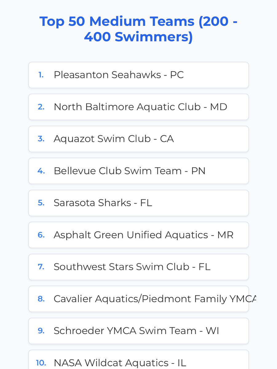 There were 50 teams ranked in each category of: large (400+ athletes), medium (200-400) and small (<200).