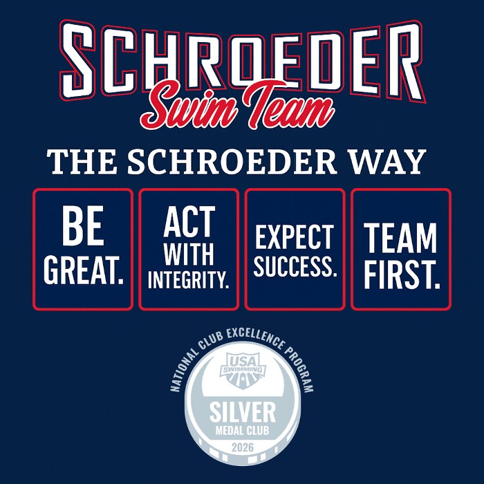 The Schroeder Swim Team has once again been honored as a USA Swimming Silver Medal Club through the National Club Excellence Program. This recognition distinguishes USA Swimming member clubs that have achieved exceptional competitive success over the past year and highlights our team’s continued growth and excellence within the national swimming community.