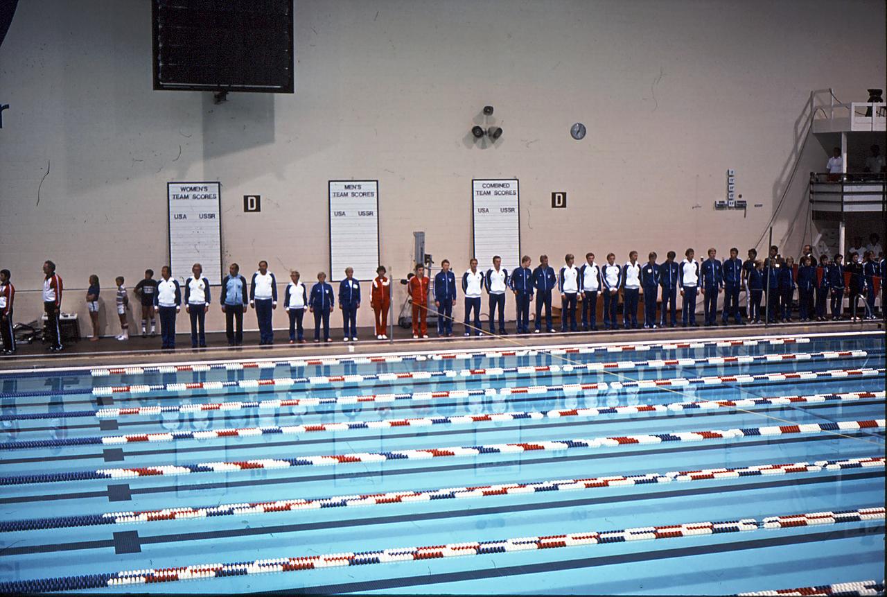 Tom Michelson found this historic photo. I asked for more background and Geri was able to nail it down! It was 1981. Jimmy Carter, 1980….we boycotted the Olympics. In the summer of 1981, the USA National Team were split in two…..half went to Russia to swim and the Russians sent half to swim the USA at Schroeder. Lots of stories. We were not allowed to sell them anything with the USA on it……and they all wanted it! So, we exchanged in the bathrooms. We bought Levis for them and...
