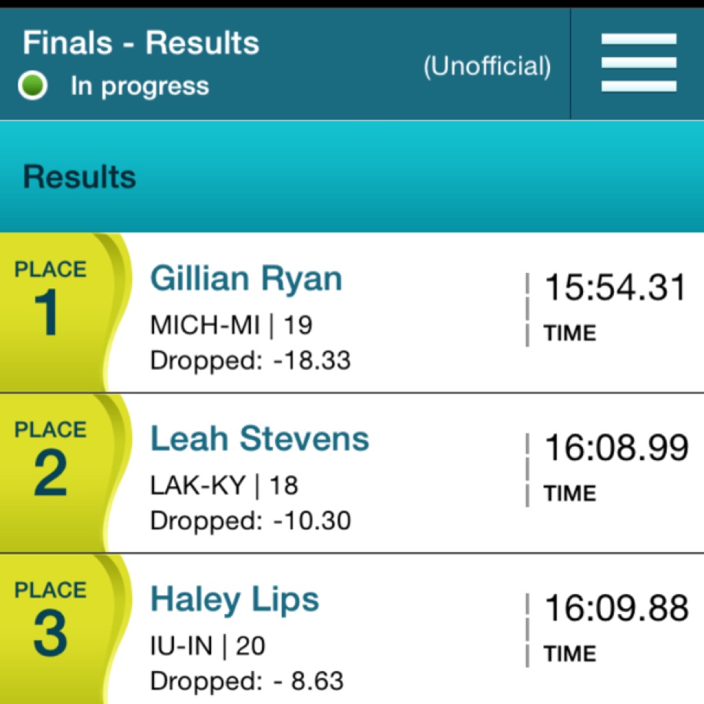 Hannah Saiz was out faster than prelims at 25.0 and finished at 53.4 a tenth faster than this morning! Great swim! Tomorrow all three will race Cass has the mile, Hannah the 200 fly and Gwen has the 200 breast
