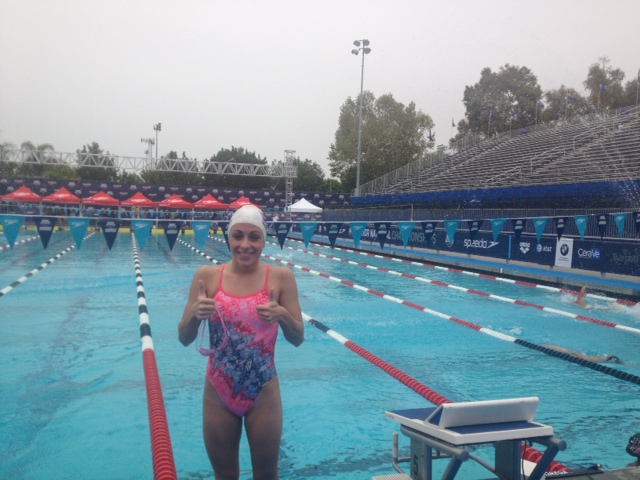 Gwen Worlton raced the prelims in the 100 Breast this morning in Irvine, CA. Her time of 1:13.1 was off her best by less than a second. Gwen races again later in the week in the 200 Br and Alex Meyers will race the 50 M Free too.