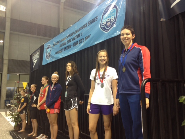 Schroeder enjoyed a good first day at the 2014 Speedo Section 1 Championships in Iowa City. The team is in 4th place in combined scoring behind Wisconsin, Minnesota and Northwestern, the men are 18th and the women are second to Wisconsin. Two team records were made today. Kaylyn Schoof took the 11/12 girls 100 Free record (Alex Meyers) and Katie Hayes erased a very old Katie Hazelwood - early 80's - 13/14 200 Breast. Hannah Saiz won the 200 Fly and Ashlyn Schoof grabbed 4th and Rina...