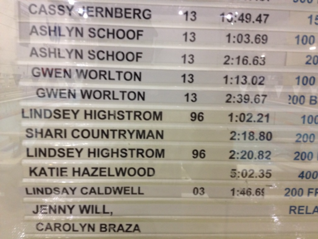 The great Lindsey Highstrom's 1996 100 M fly record was taken down early in this LCM season by Hannah Saiz at a LCM sectional tonight in Indy. 1:01.7. Looking forward to the 200 fly tomorrow and out to Irvine at the end of the summer! Added 3/29: Hannah bettered a Shari Countryman record in the 200 Fly posting a 2:14.58 tonight in Indy. Tow big names come off the board. Only 8+ seconds to go for a WSAC pool record!