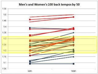 BY RUSSELL MARK // HIGH PERFORMANCE CONSULTANT Many coaches and swimmers use tempos to guide their race strategy and preparation. A common question asked is what the tempos are for a specific event. Looking at eight different male backstrokers under 53.30 and eight different female backstrokers under 59.70, you might be surprised at what we find out. Highlights: 100 backstroke tempos are generally in the 1.2 – 1.3 seconds per cycle range for both 50’s for both genders. Most tempos are slightly slower on the second 50 than the first...